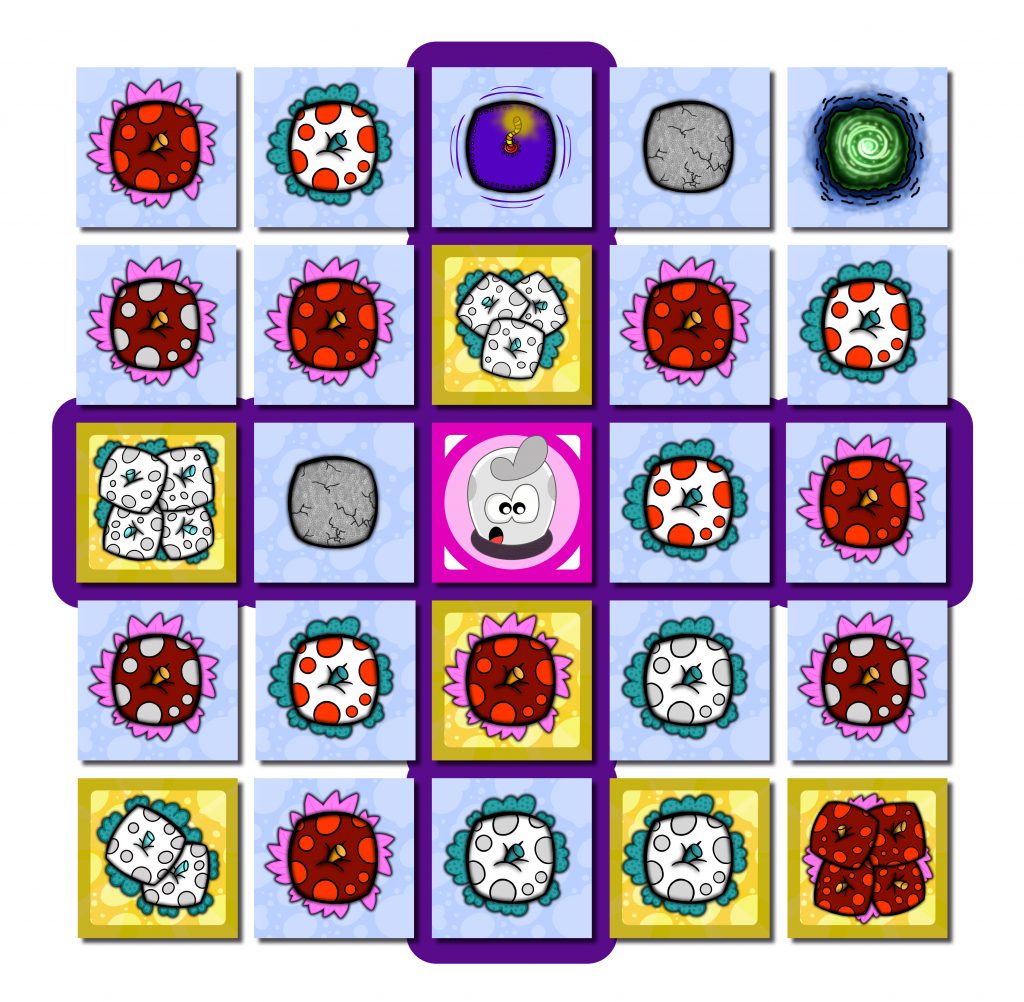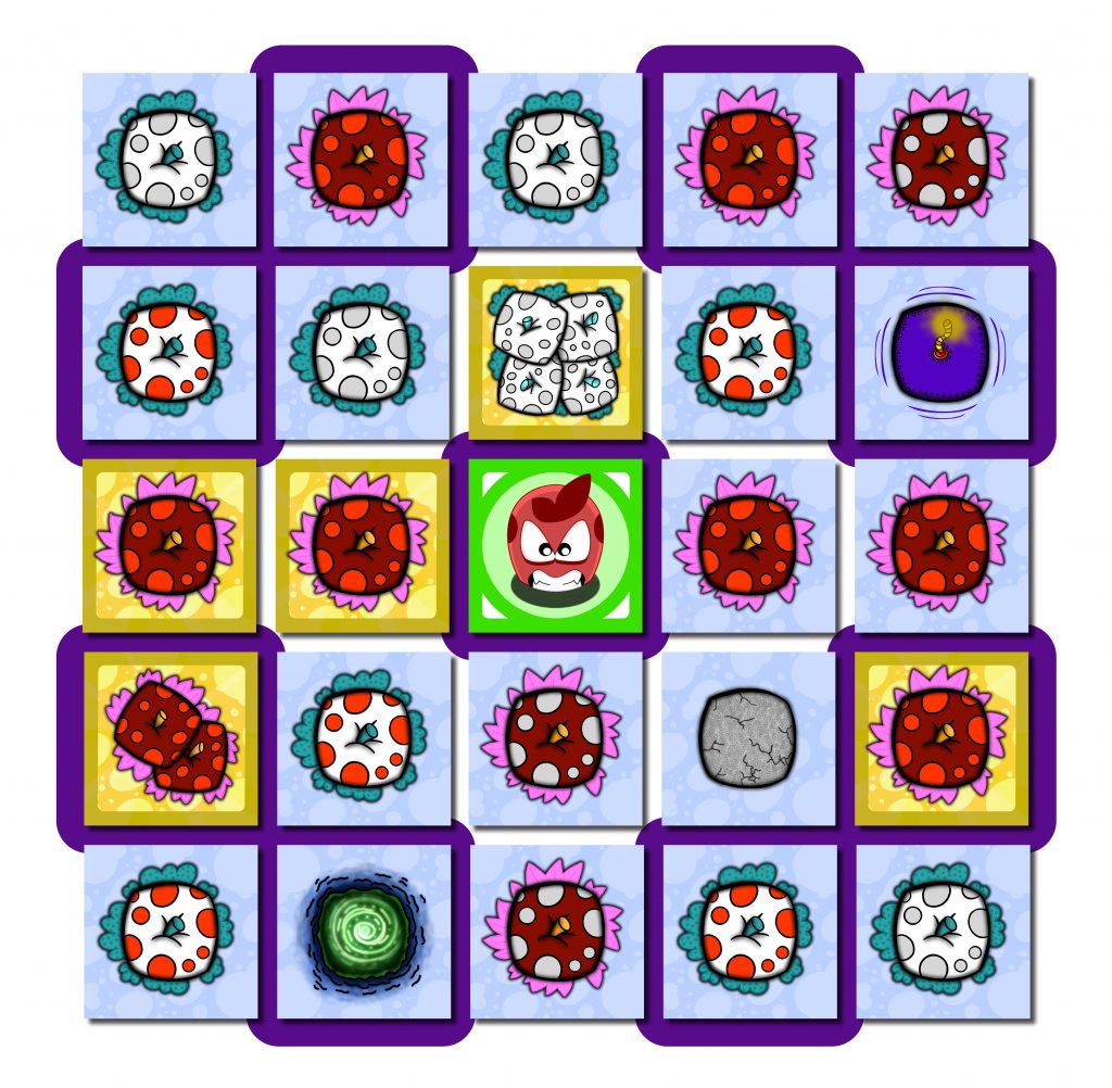 CAPACIDADES A DESARROLLAR: Coordinación, estrategia, atención y lógica. A la vez que practicamos los movimientos en «cruz» del personaje blanco. Recordando, que el komupple blanco, puede saltar a 1 o 2 casillas de distancia, en cualquiera de las 4 direcciones principales (arriba, abajo, derecha o izquierda)