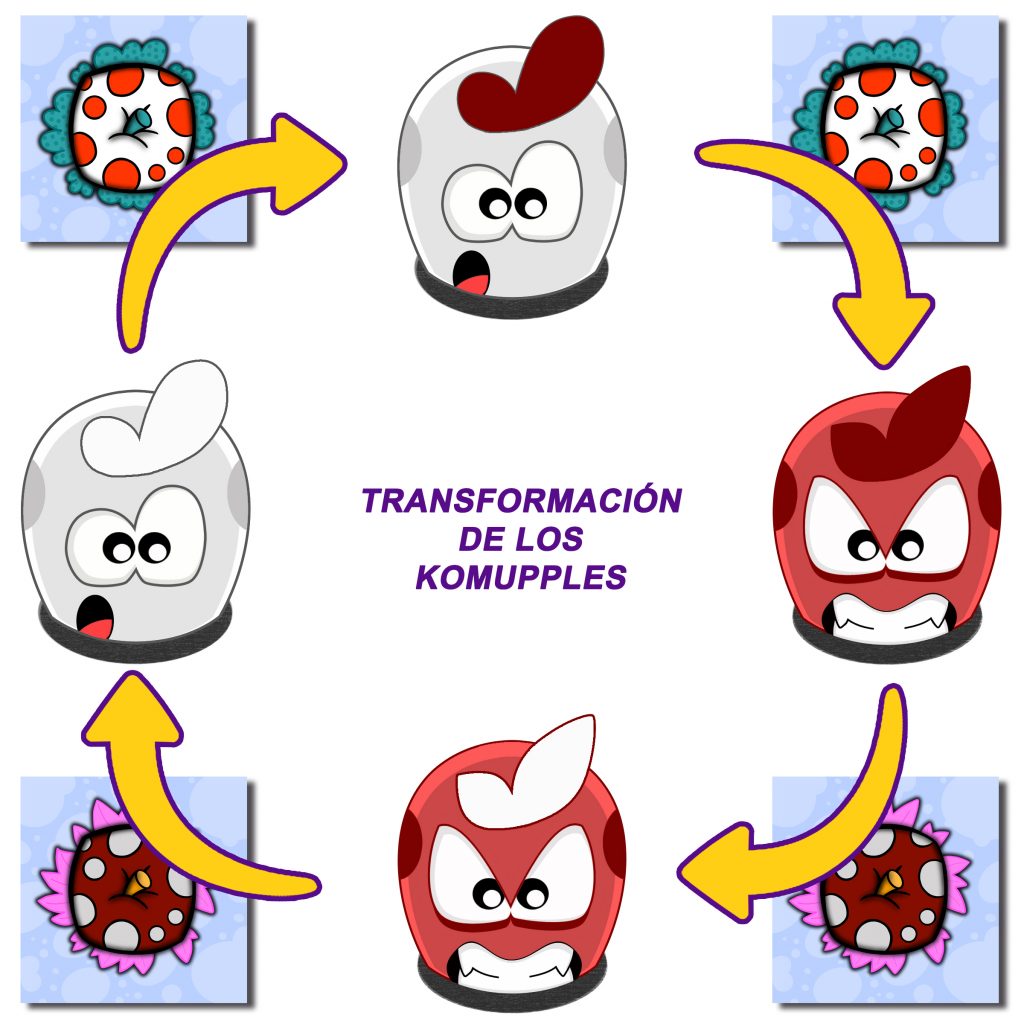 Juego: Al igual que el juego original upples jugaremos con una cuadrícula sobre la mesa, pero esta vez de 6×6 cartas. El único personaje que podrá usarse será el komupple blanco, con pelo blanco, que no cambiarán en ningún momento de la partida.